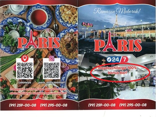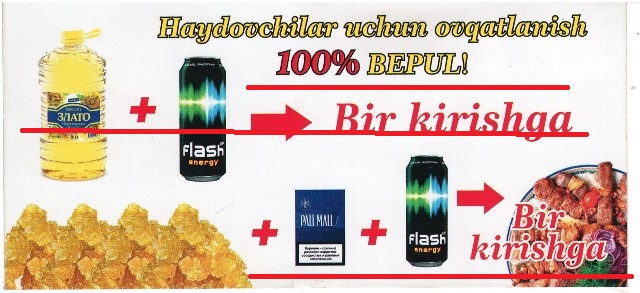 Ундан ташқари «Сардоба» ЙПХ постида ҳам қўлларига ошхона номи ёзилган ташриф қоғозини машинангизга ташлаб юборишади. Ташриф  қоғозини ўқисангиз йўловчилар билан ошхонага ташриф буюрган ҳайдовчиларга овқатланиш 100 фоиз бепул эканлиги қайд этилган. Ундан ташқари 5 литрлик идишда кунгабоқар ёғи ва «Фреш» ичимлиги ҳам текинга «Бонус» сифатида берилиши кўрсатилган.