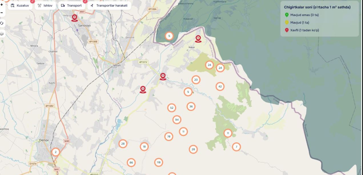 Айни дамда https://locust.uz/cabinet/map Термиз, Бойсун, Шерабод, Жарқўрғон, Қумқўрғон, Шурчи, Олтинсой, Денов, Узун ва Сариосиё туманлари ҳамда чегарадош ҳудудларда жами 96 400 гектар майдонда кузги кузатув ишлари амалга ошириш белгиланган. Ҳозирги кунда юқоридаги туманларда 55 255 гектар майдонда кузтув ишлари олиб борилган. Кузатув ишлари жараёнида 1 метр квадрат майдонда ўртача 1-14 тагача кўзачалар борлиги аниқланмоқда. Мутахассислар томонидан кузатув-назорат ишлари давом эттирилмоқда.