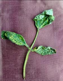 Мош мозаикаси. Хавфли вирус ка-саллиги бўлиб, у мош дони ҳосилини 55-70%га, кўк массасини эса 30-65%га камайтиради. Зарарланган барглар то-мирлари атрофида қорамтир хошия пайдо бўлиб, барг четлари букилади. Сўнгра баргларда яққол кўзга ташла-нувчи мозаика ривожланиб, улар кучли ғижимланган шакл олади. Ўсимлик бўйи пасаяди ва ривожланишдан орқада қолади. Агар каслликларни ўз вақтида олди олинса, ҳосилдорлик юқори бўлиб, деҳқон баракасига барака қўшилади. Ички бозорларимизга арзон ва сифатли маҳсулот кириб келишига эришилади.